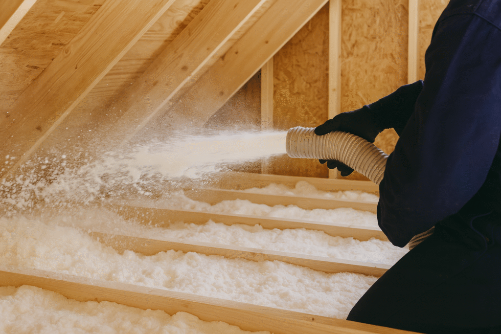On souffle un isolant en vrac dans les combles à l’aide d’une machine. C’est rapide, efficace et particulièrement adapté aux espaces difficiles d’accès.
